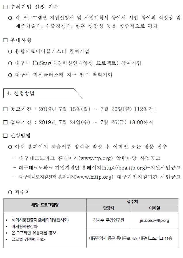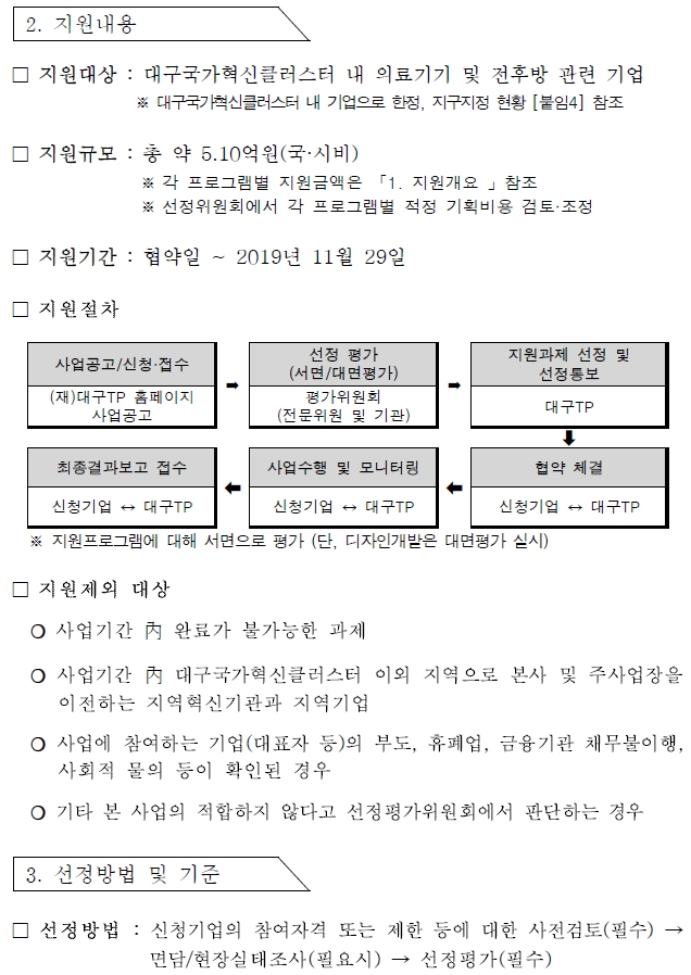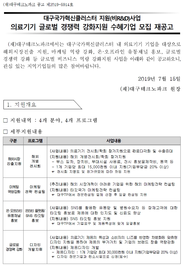 의료기기 글로벌 경쟁력 강화지원 수혜기업 모집 재공고_「대구국가혁신클러스터 지원(비R&D)사업」